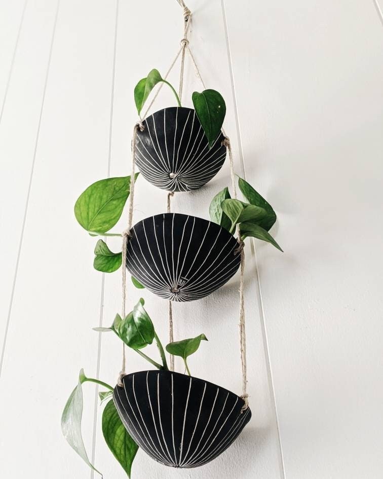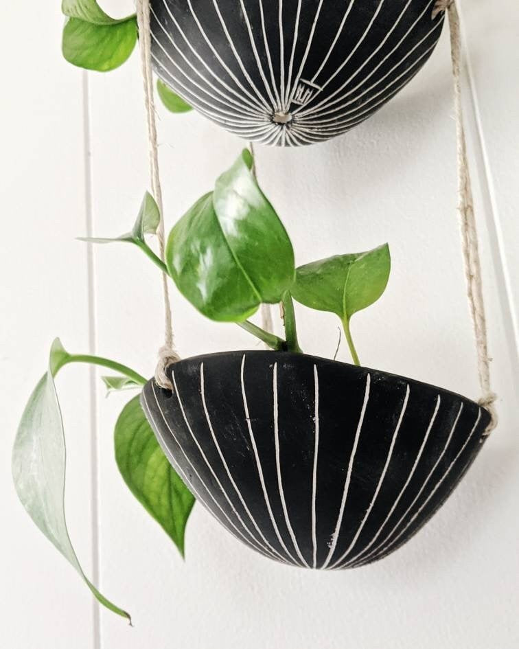 Black and White Hanging Planter - Triple Tier Earthenware with Hand-Carved Detail & Drainage