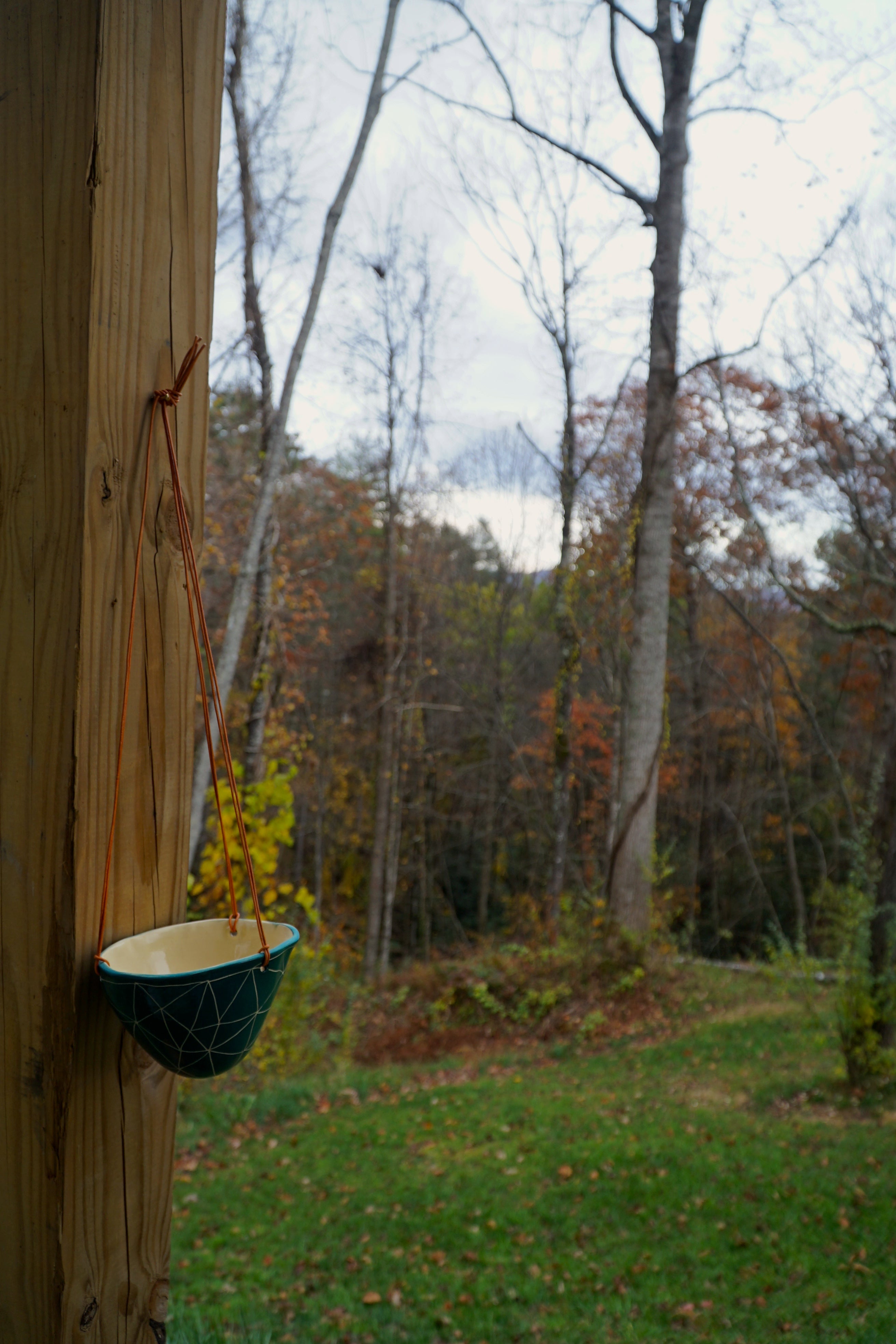 Ceramic Hanging Planter – Handcrafted Earthenware Pot with Sgraffito Design & Drainage - Teal and White