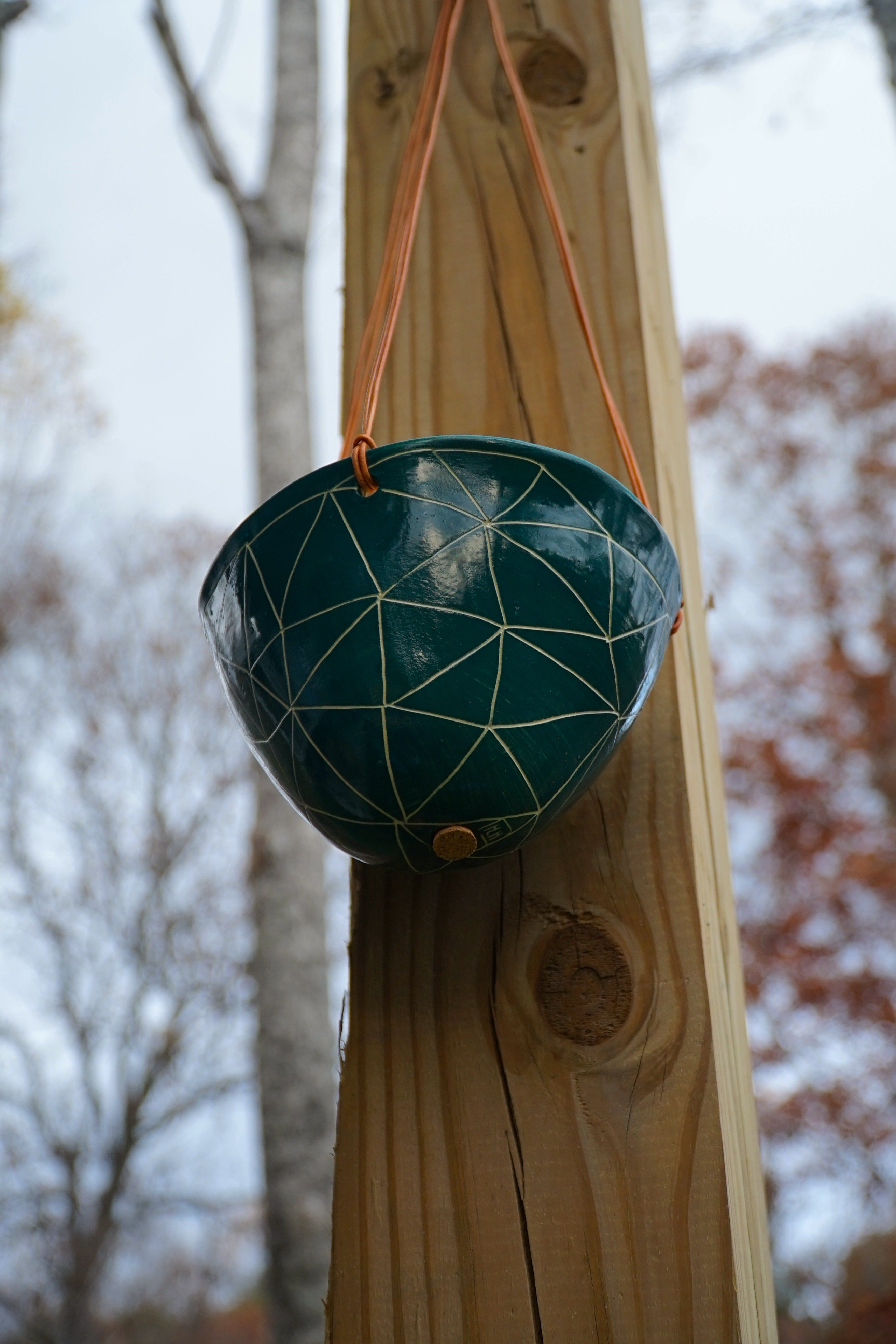 This ceramic hanging planter features a vibrant teal and white earthenware geotriangle design, crafted to elevate your indoor or outdoor greenery with style and durability. The ceramic hanging planter offers a unique sgraffito pattern hand-carved through earthenware, combining artistic charm with practical functionality for plant lovers seeking a decorative pot that enhances any space.