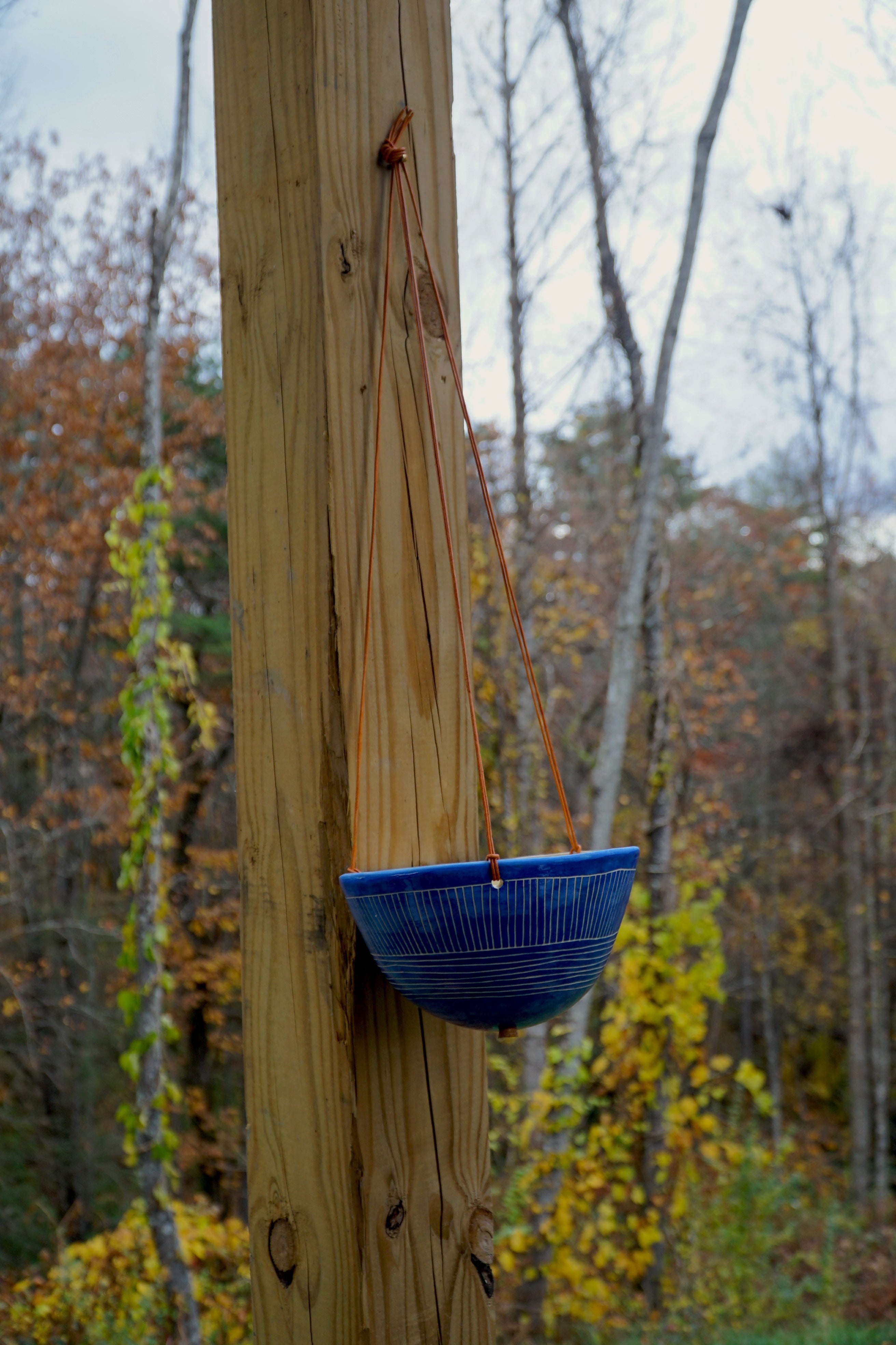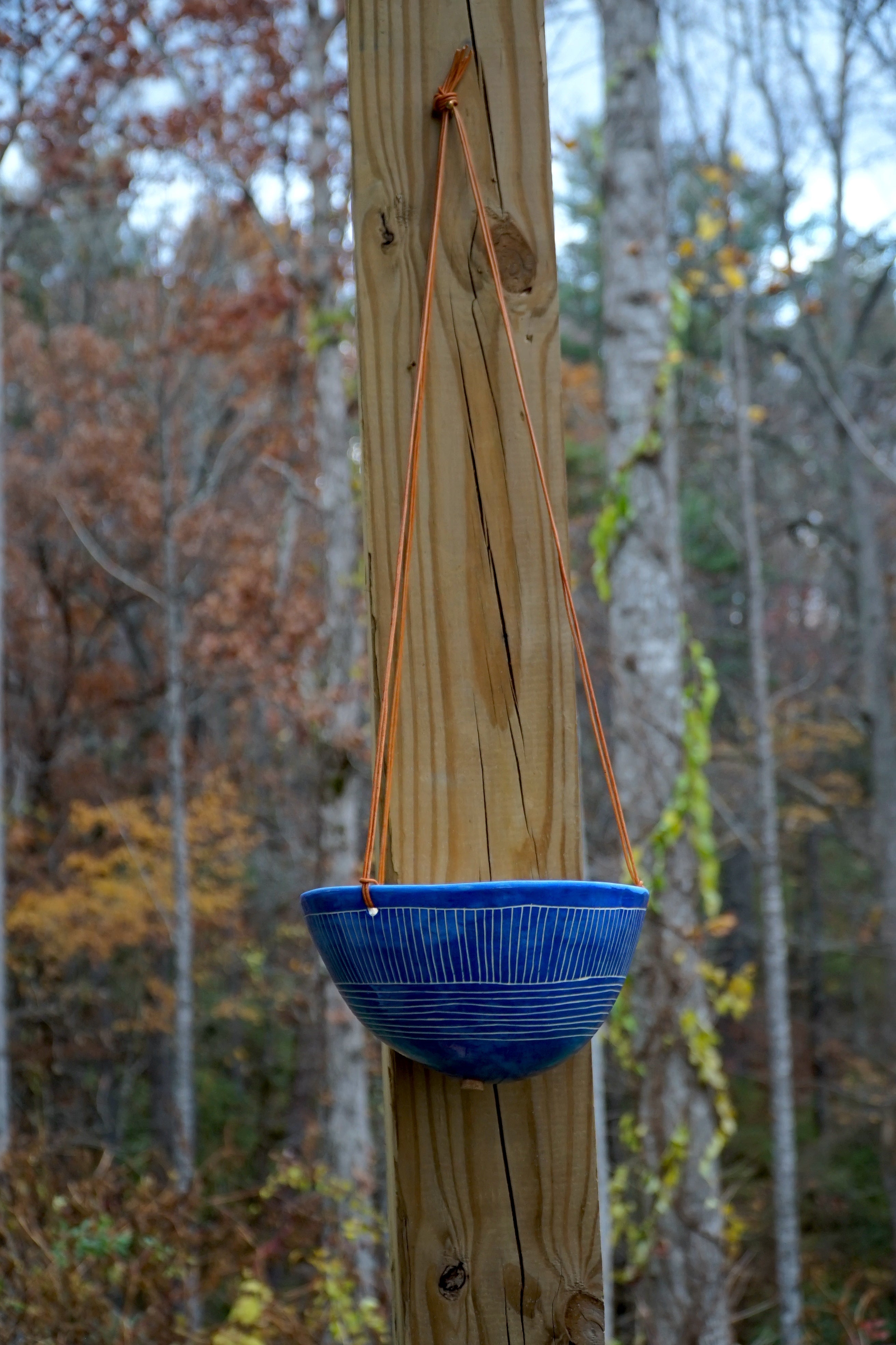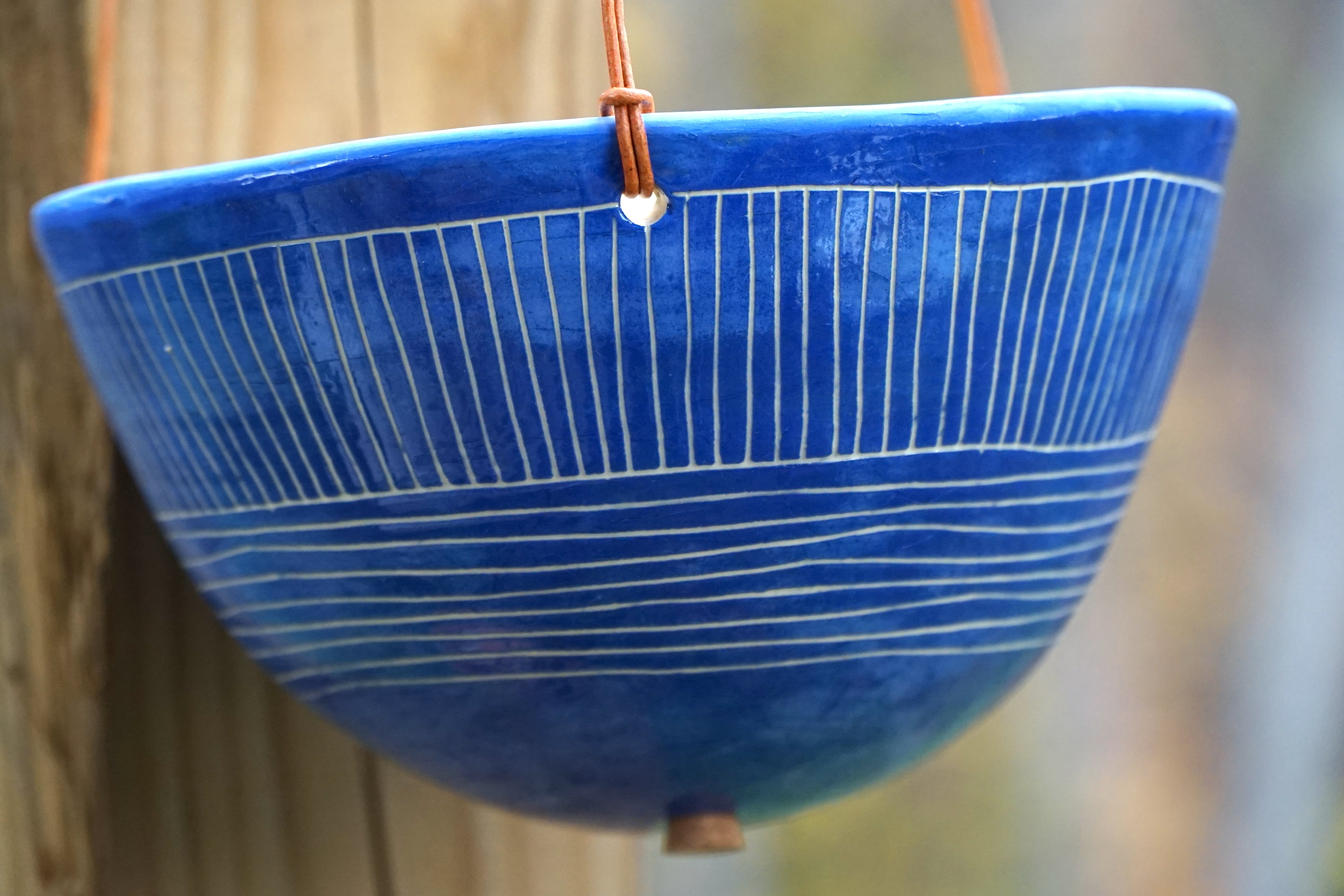 This large ceramic hanging planter features a vibrant cobalt blue and white earthenware, handcarved "directional line" design, crafted to elevate your indoor or outdoor greenery with style and durability. The ceramic hanging planter offers a unique sgraffito pattern carved through painted earthenware, combining artistic charm with practical functionality for plant lovers seeking a decorative pot that enhances any space.