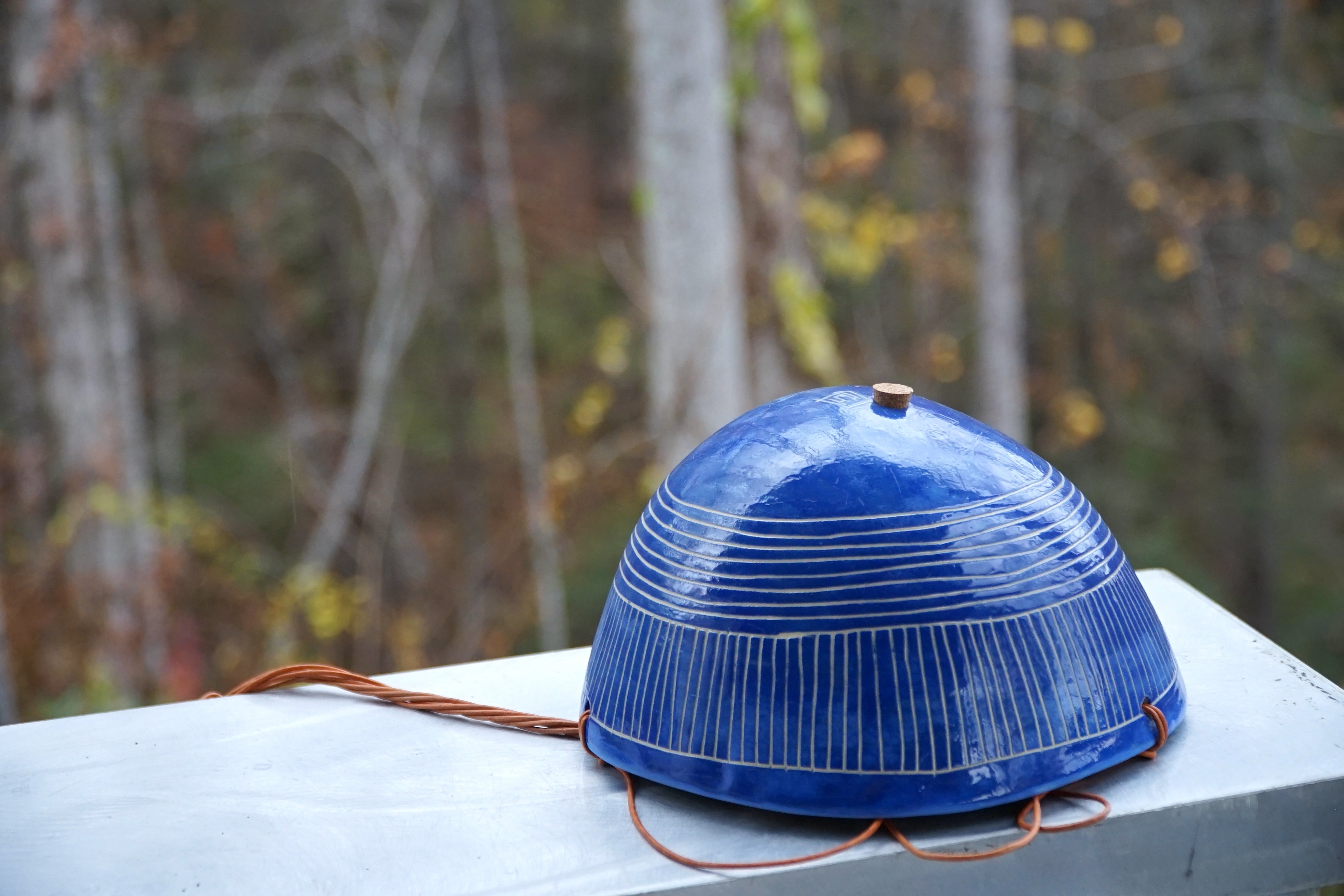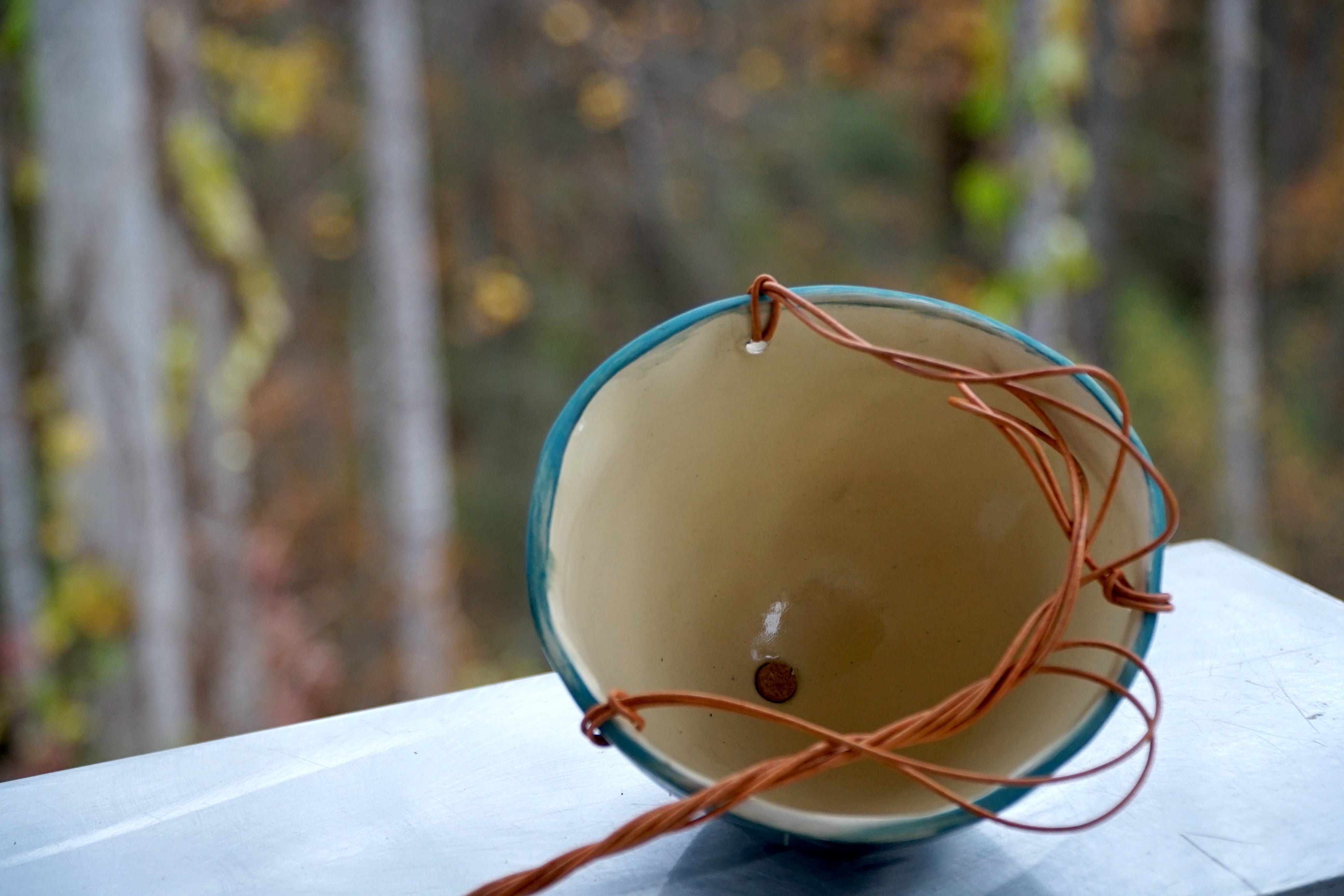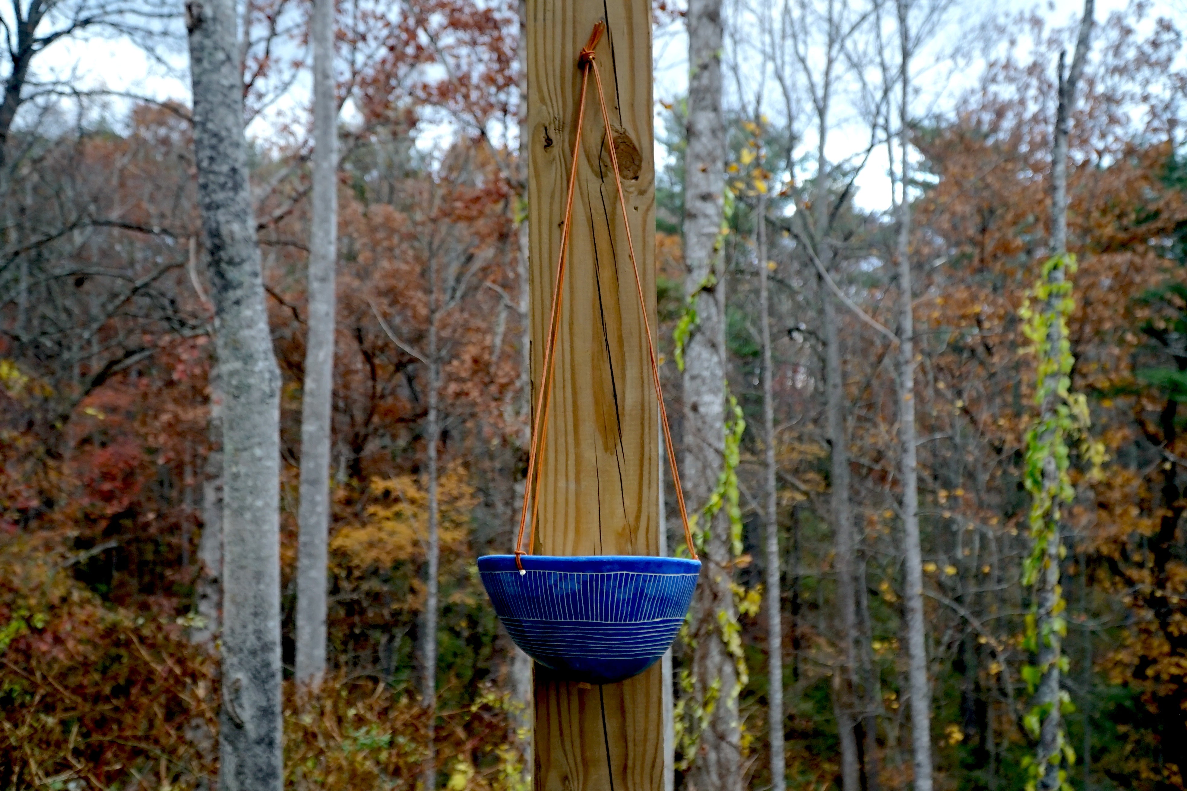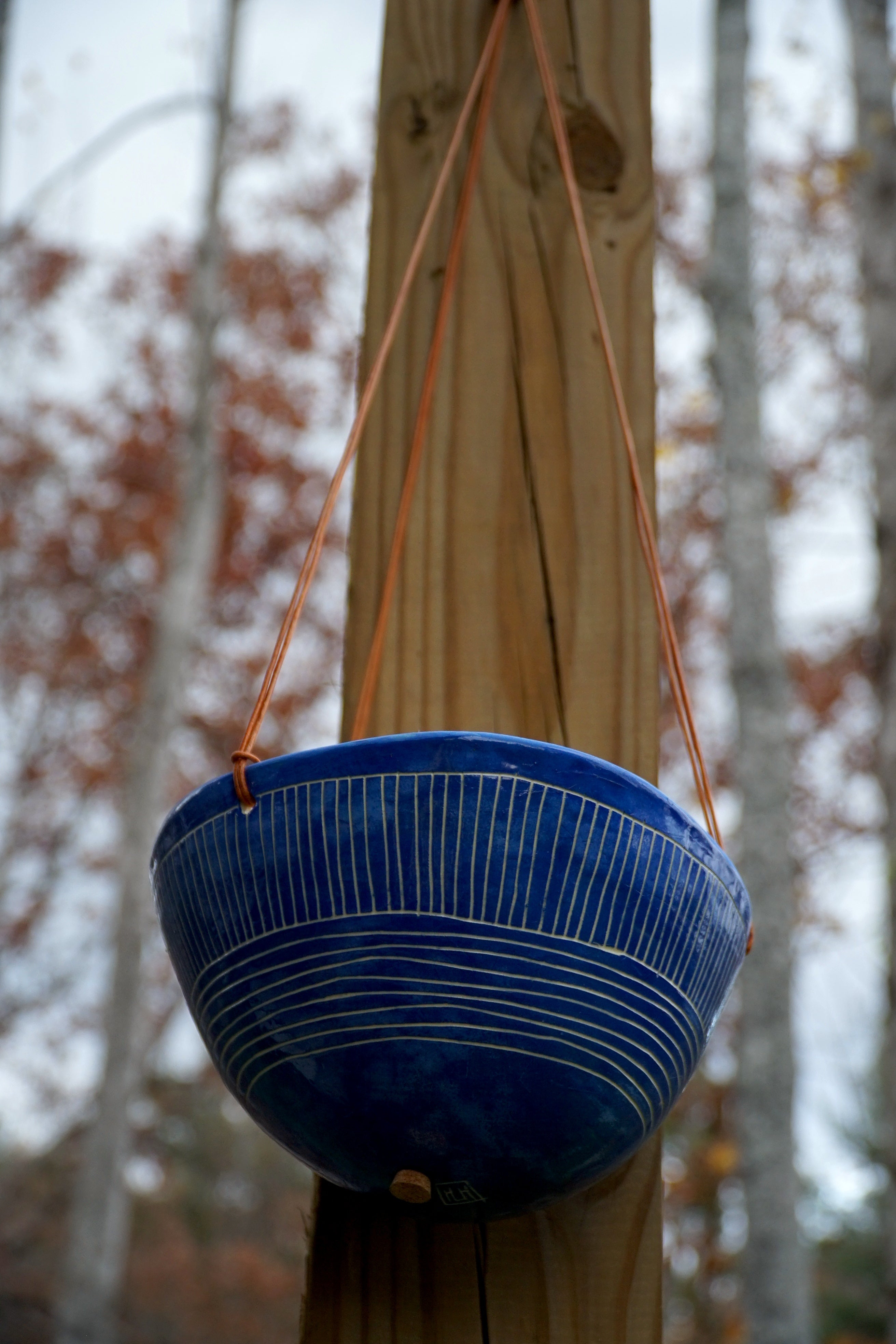 This large ceramic hanging planter features a vibrant cobalt blue and white earthenware, handcarved "directional line" design, crafted to elevate your indoor or outdoor greenery with style and durability. The ceramic hanging planter offers a unique sgraffito pattern carved through painted earthenware, combining artistic charm with practical functionality for plant lovers seeking a decorative pot that enhances any space.
