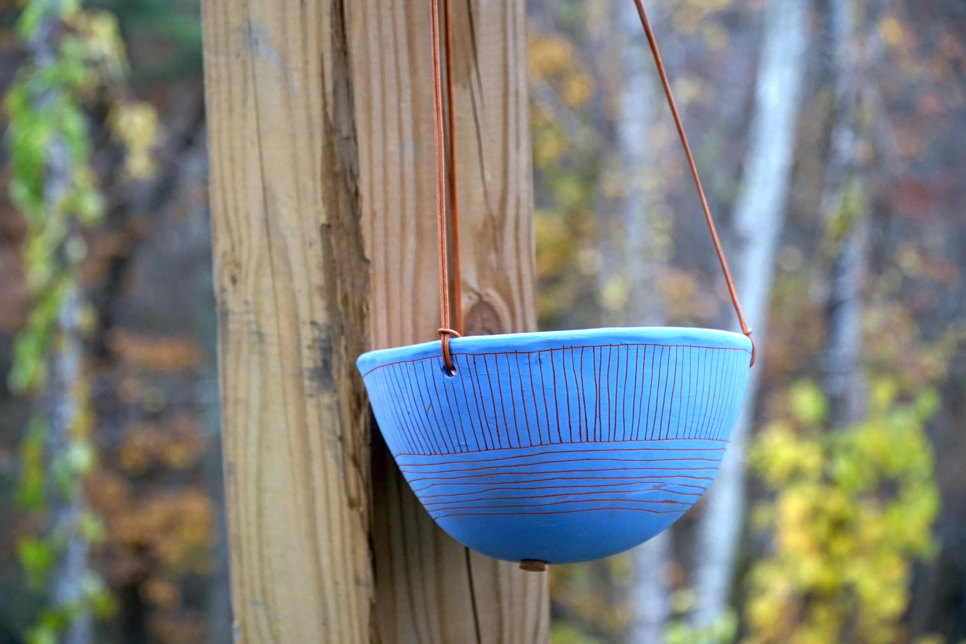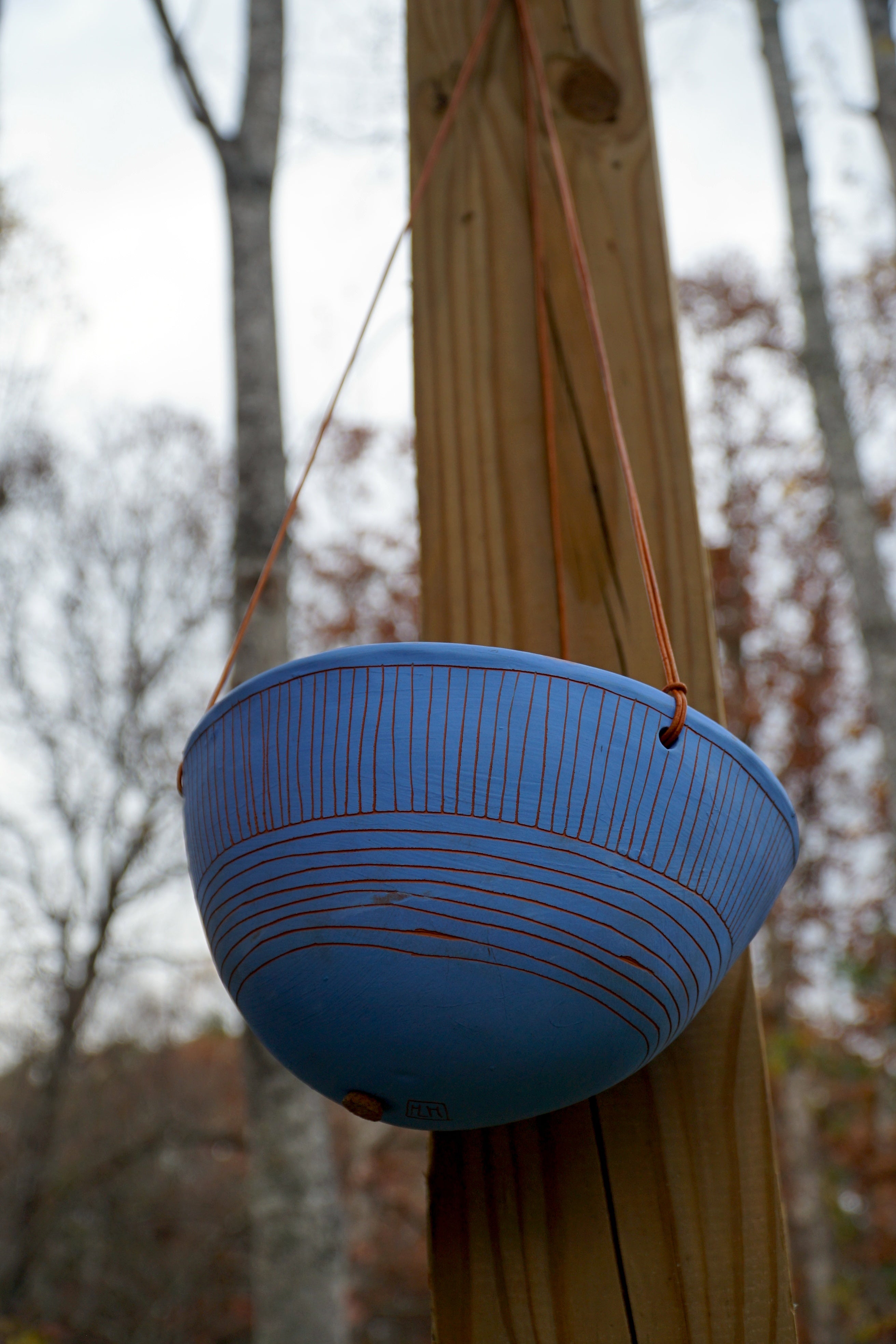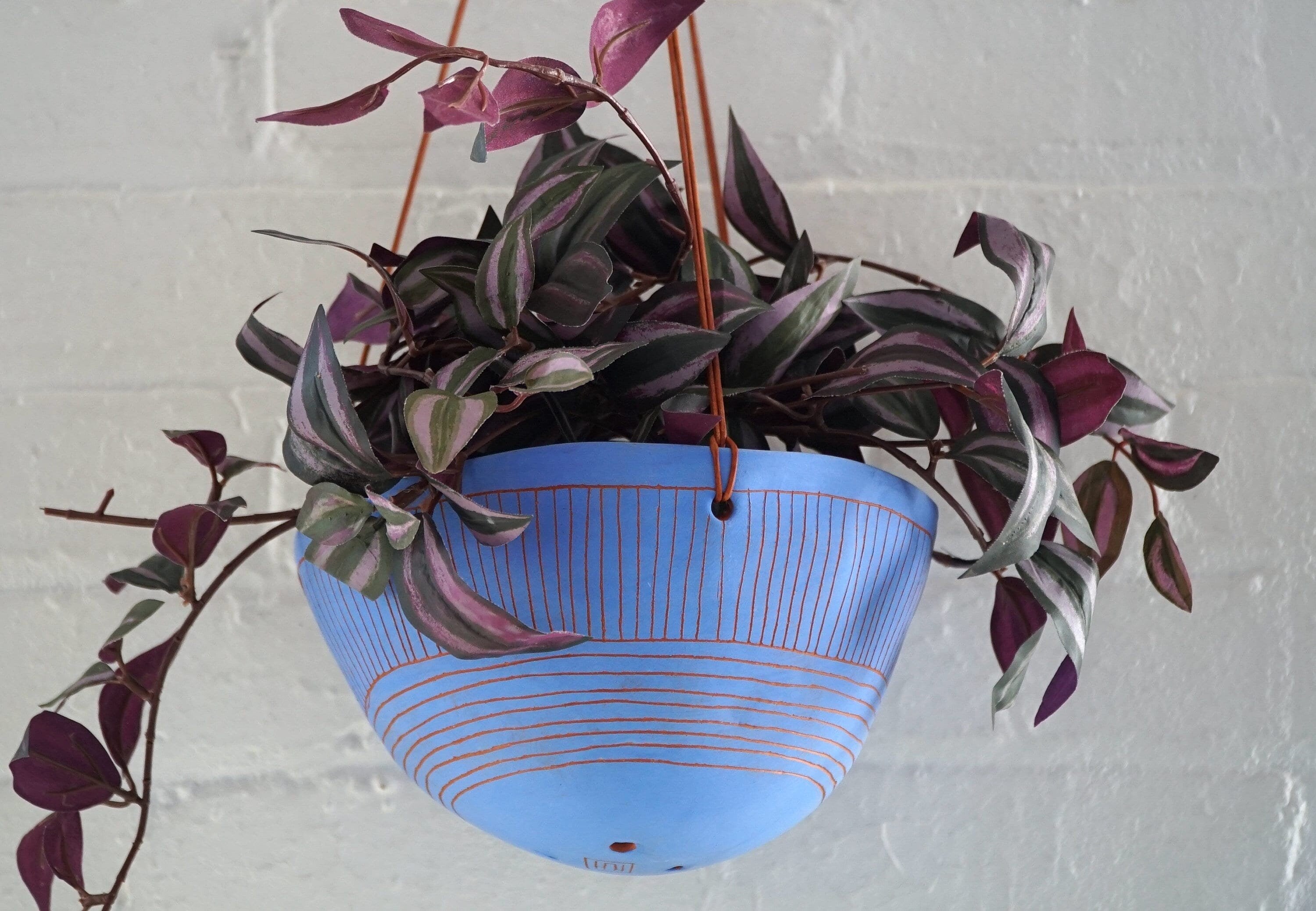 Large Matte Blue & Terracotta Hanging Planter – Hand-Carved Directional Line Design with Leather Cord & Drainage