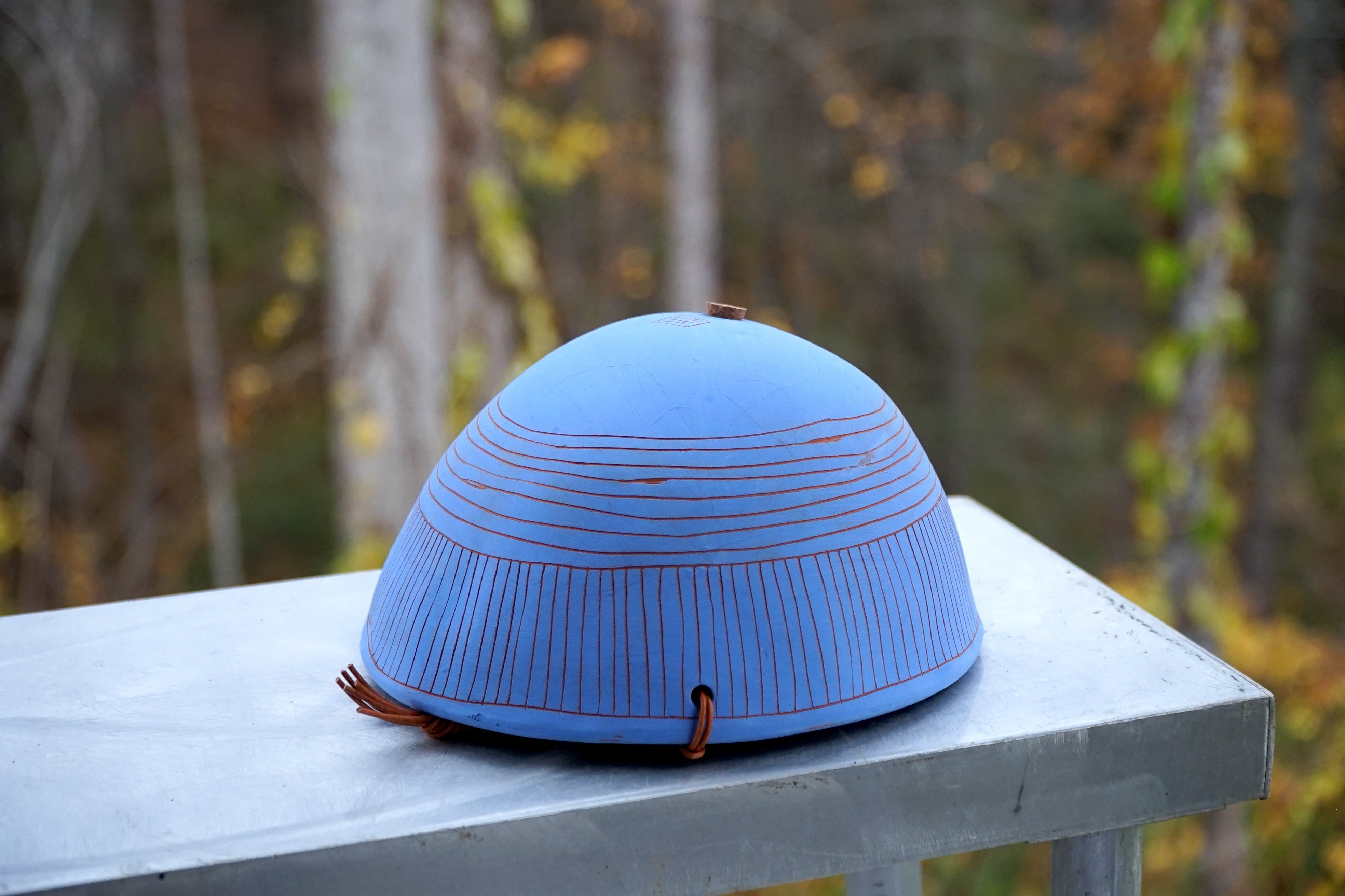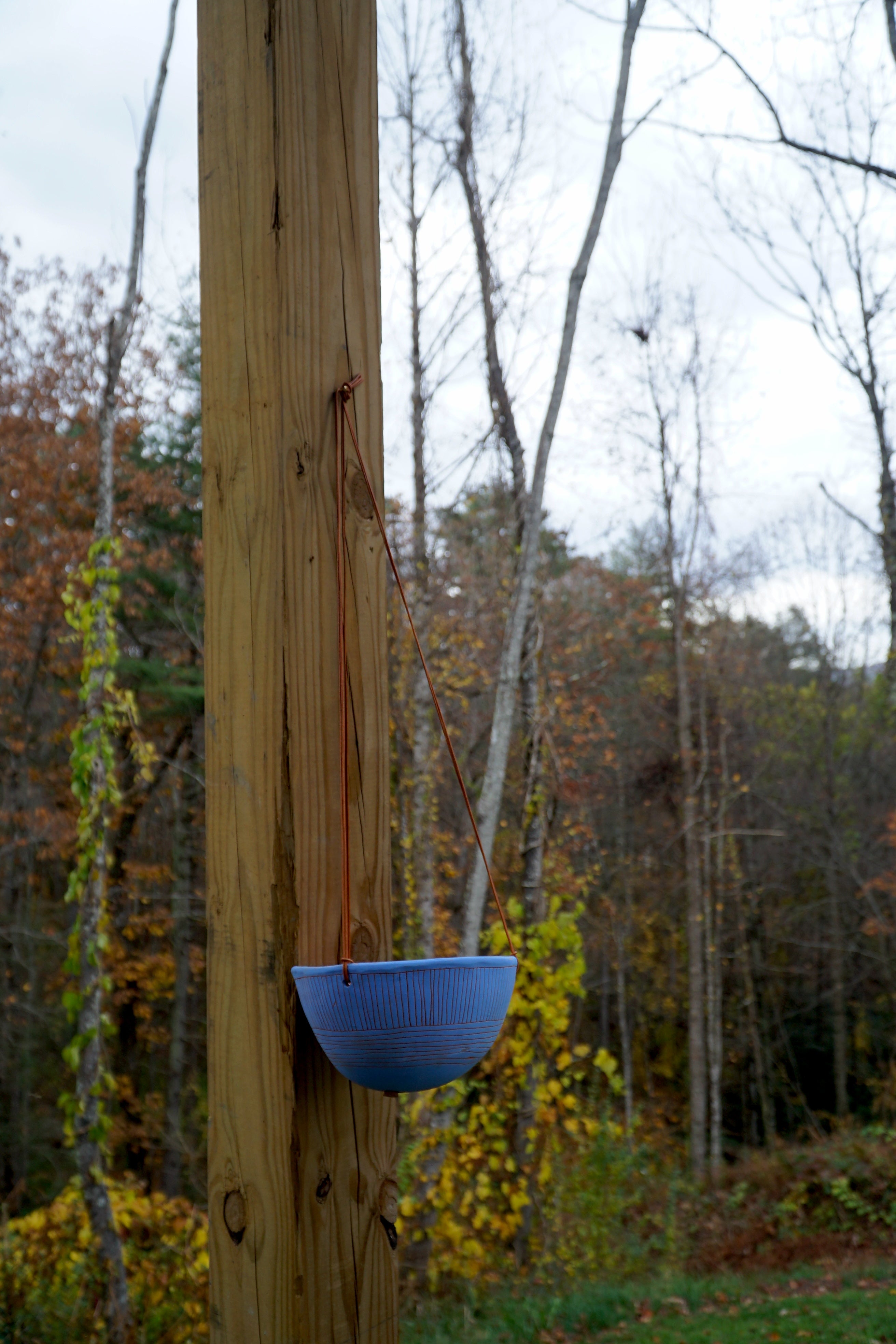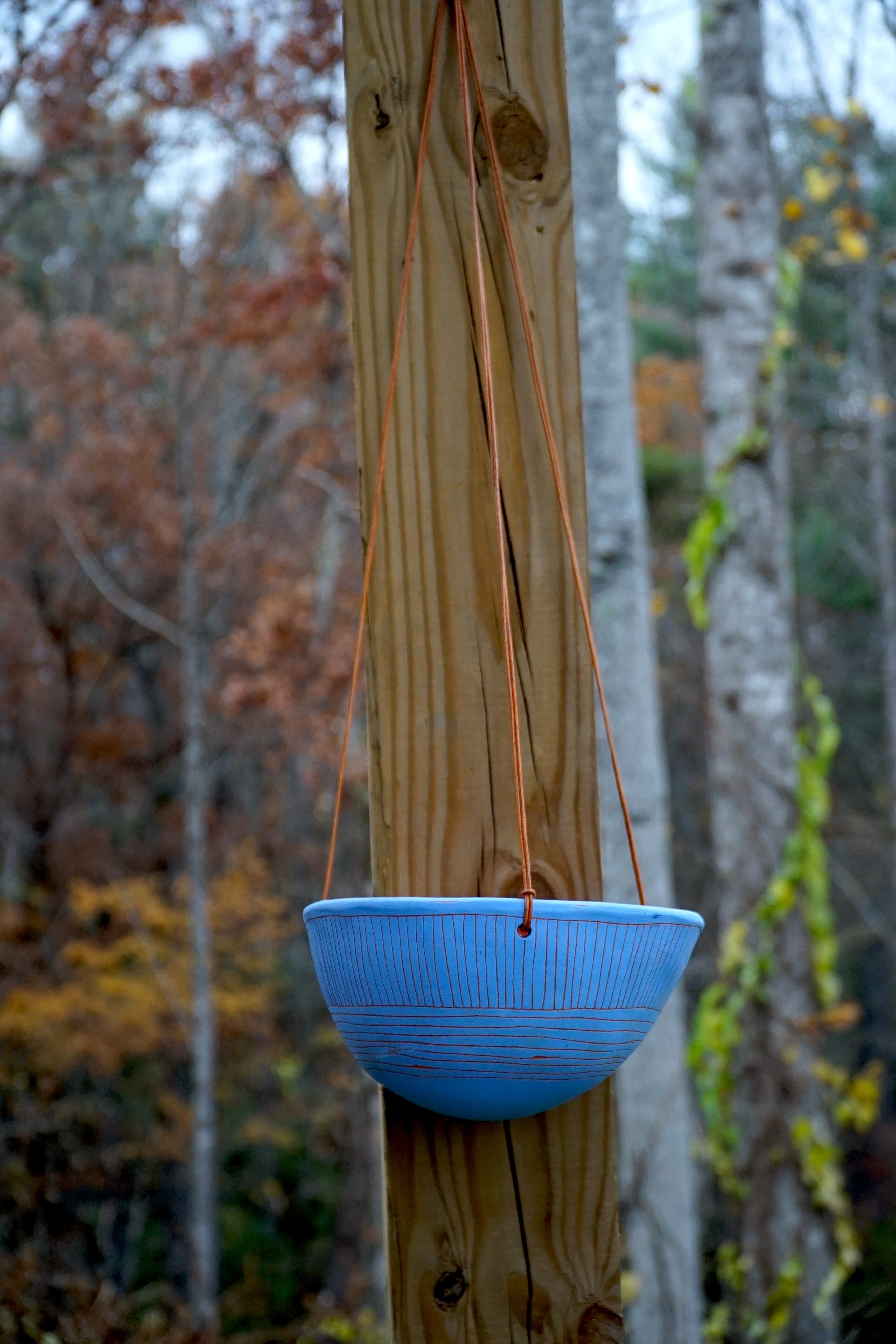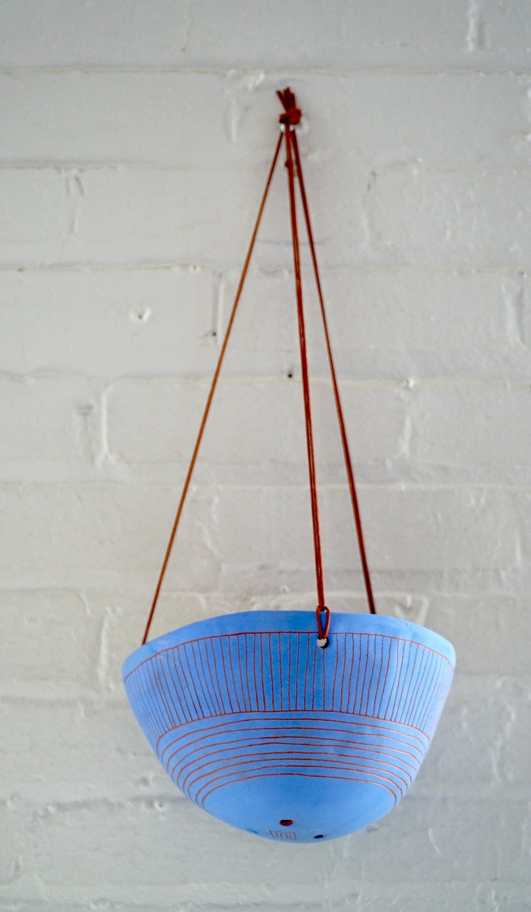 Large Matte Blue & Terracotta Hanging Planter – Hand-Carved Directional Line Design with Leather Cord & Drainage