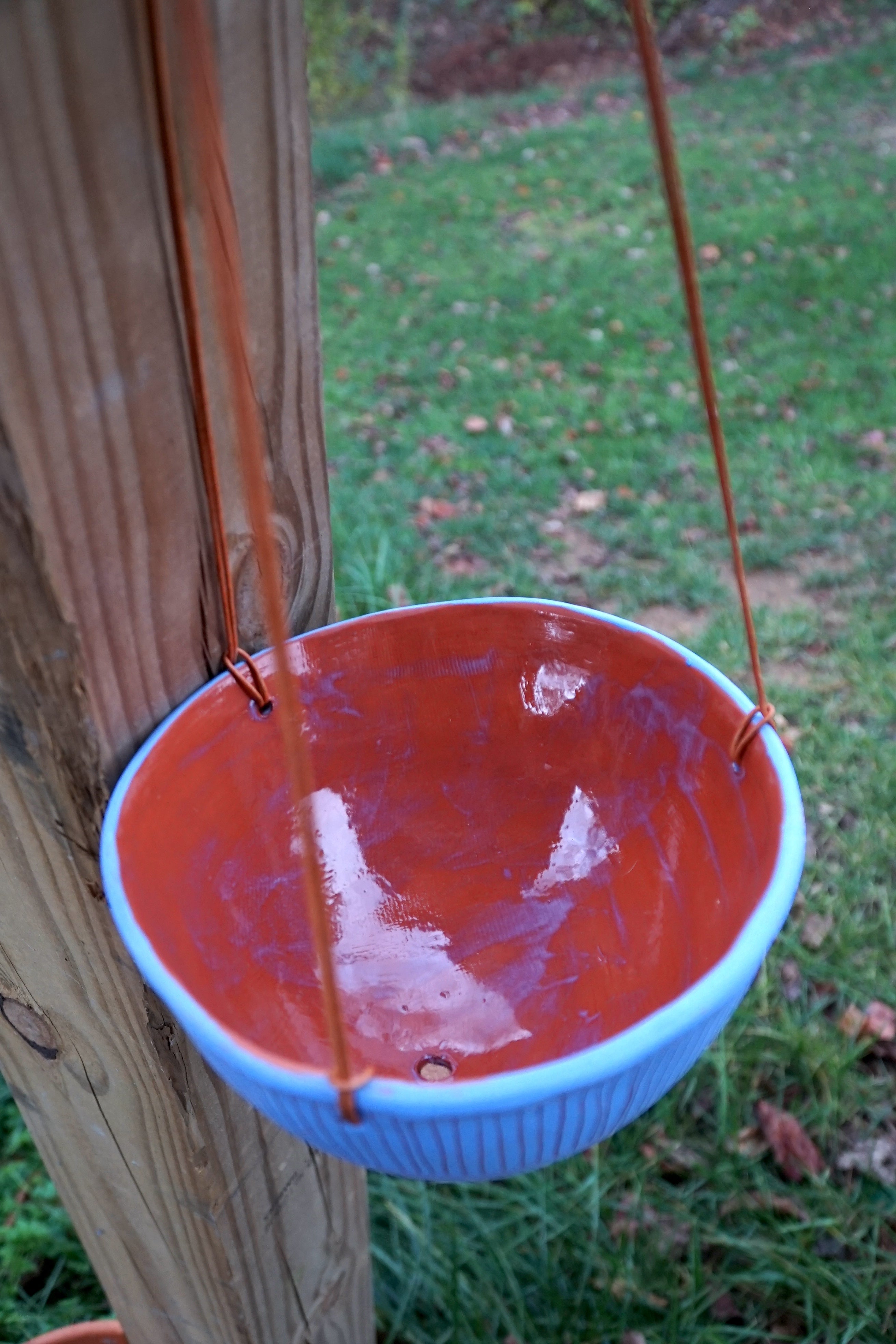 This large ceramic hanging planter features a vibrant blue and red earthenware, handcarved "directional line" design, crafted to elevate your indoor or outdoor greenery with style and durability. The ceramic hanging planter offers a unique sgraffito pattern carved through painted earthenware, combining artistic charm with practical functionality for plant lovers seeking a decorative pot that enhances any space.