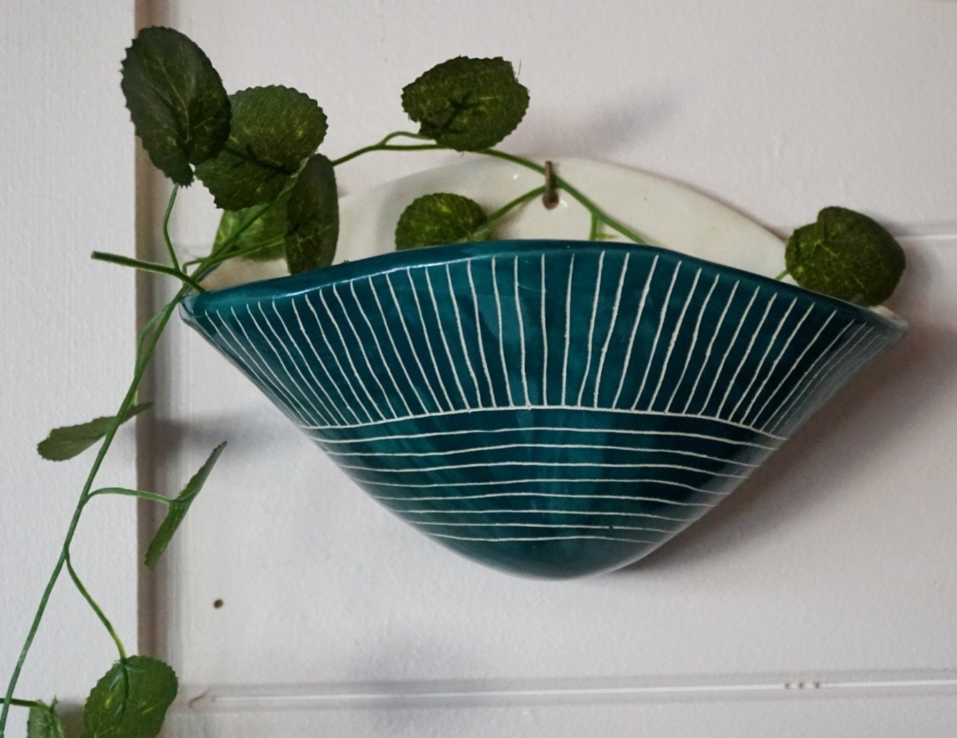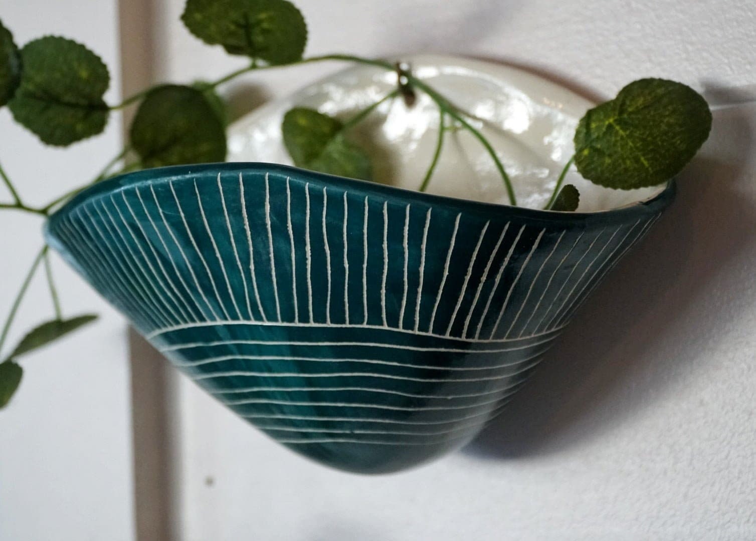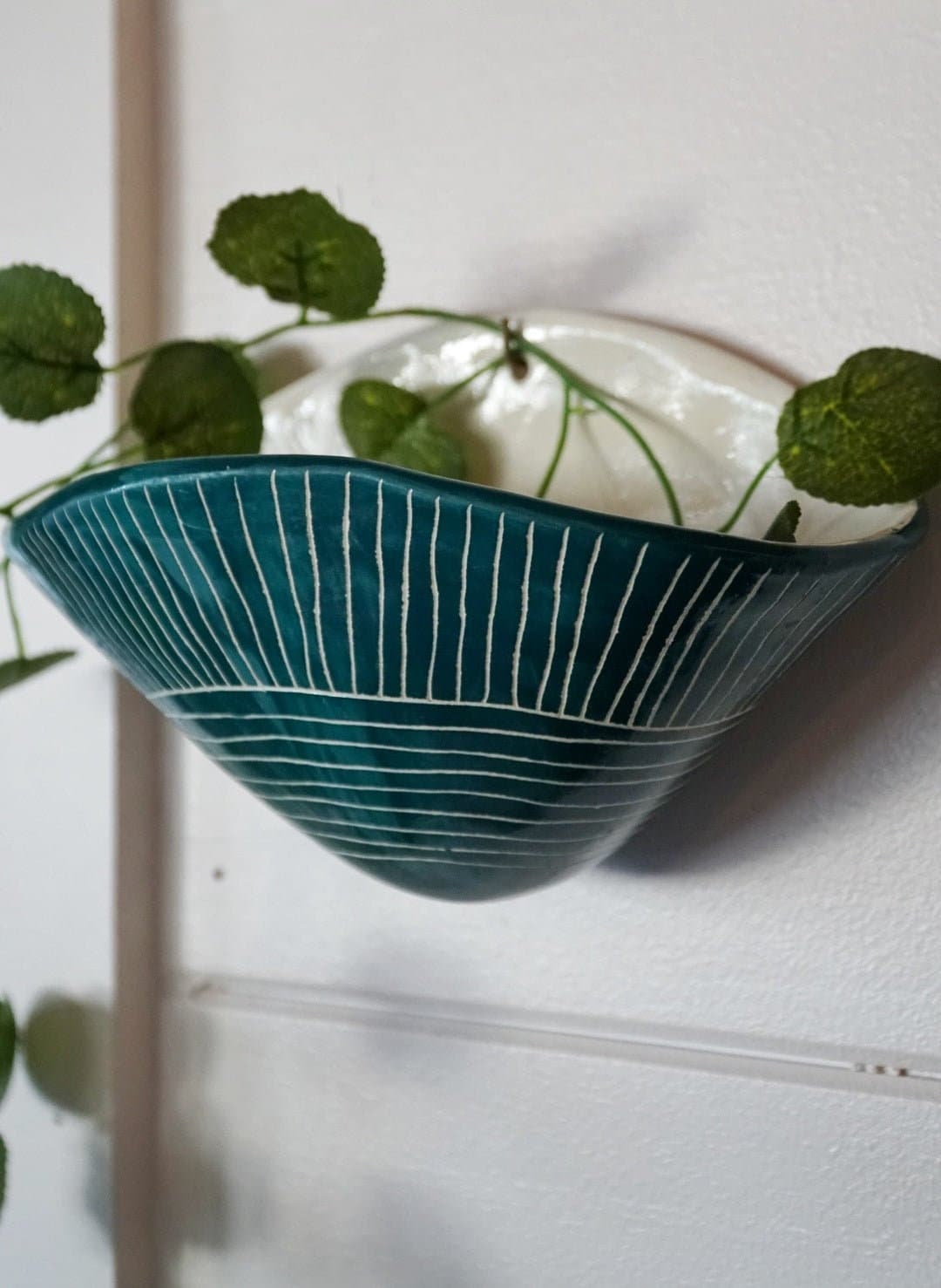 A ceramic wall planter designed to showcase your favorite succulents and trailing plants while enhancing your indoor space with modern style. This handmade pottery planter features a unique pottery sgraffito design that adds artistic flair to any room. Crafted from high-quality earthenware clay, this pot is an ideal small succulent planter or indoor hanging planter for compact spaces.