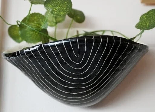 This black and white ceramic wall pocket planter is perfect for trailing plants, succulents, or air plants. Made from bright white earthenware clay, the surface is hand-painted and carved with an Arc design using the sgraffito technique for added texture and visual interest.