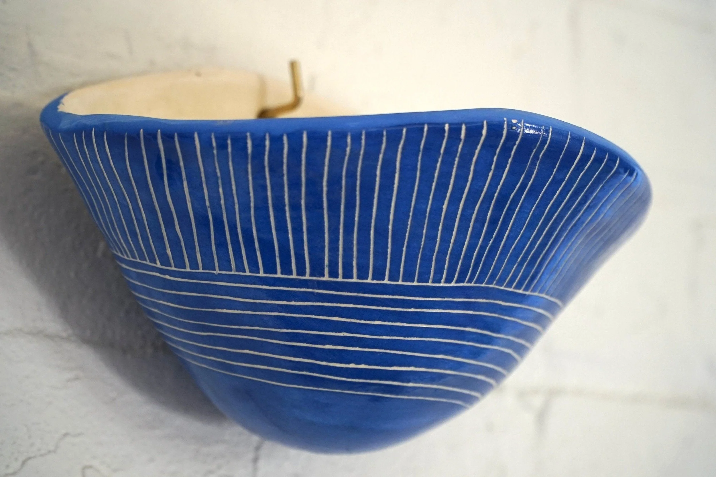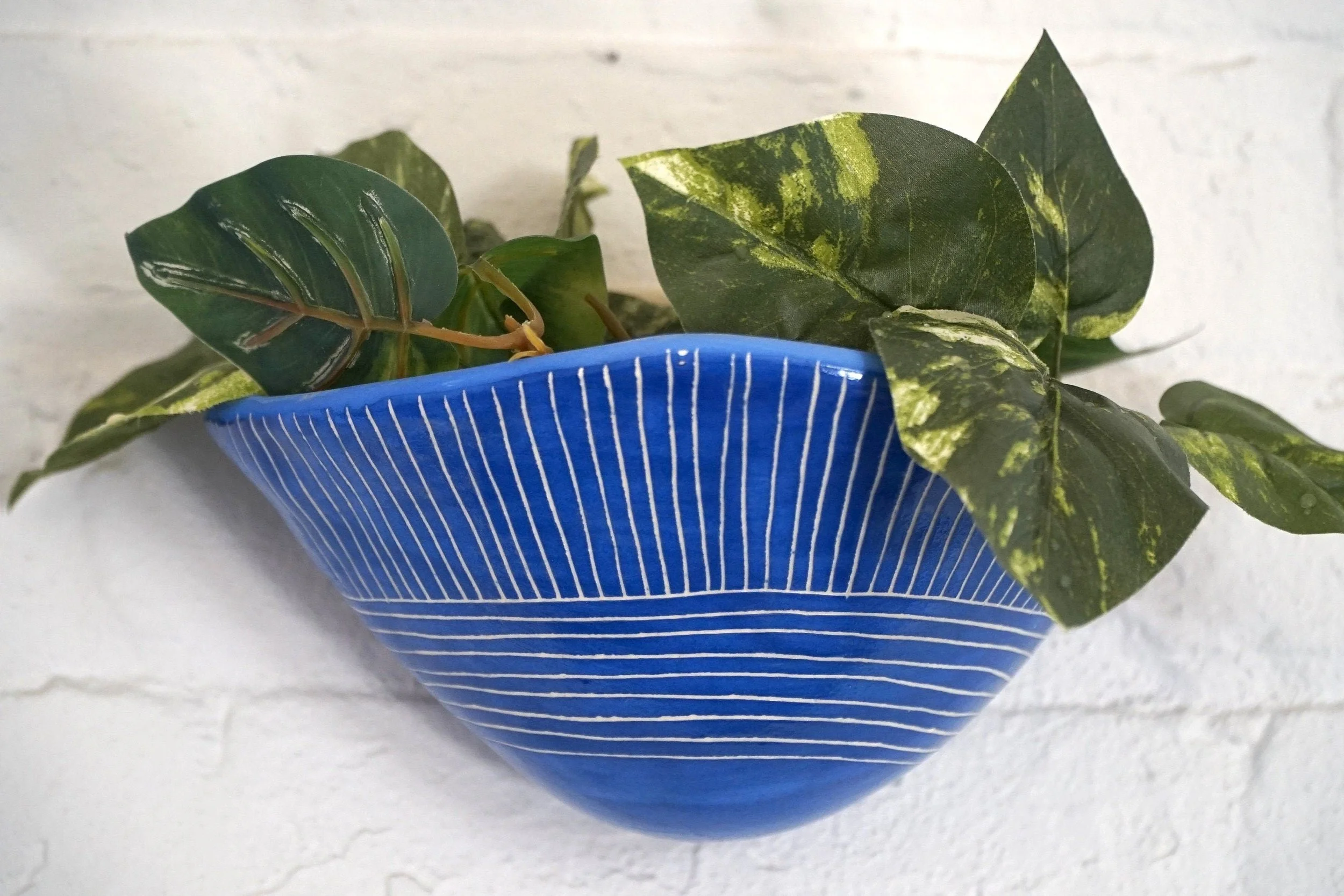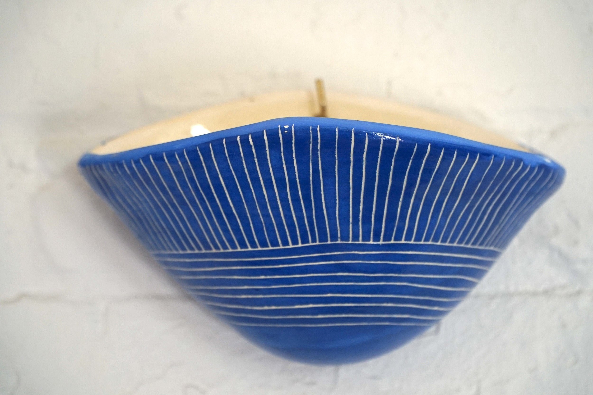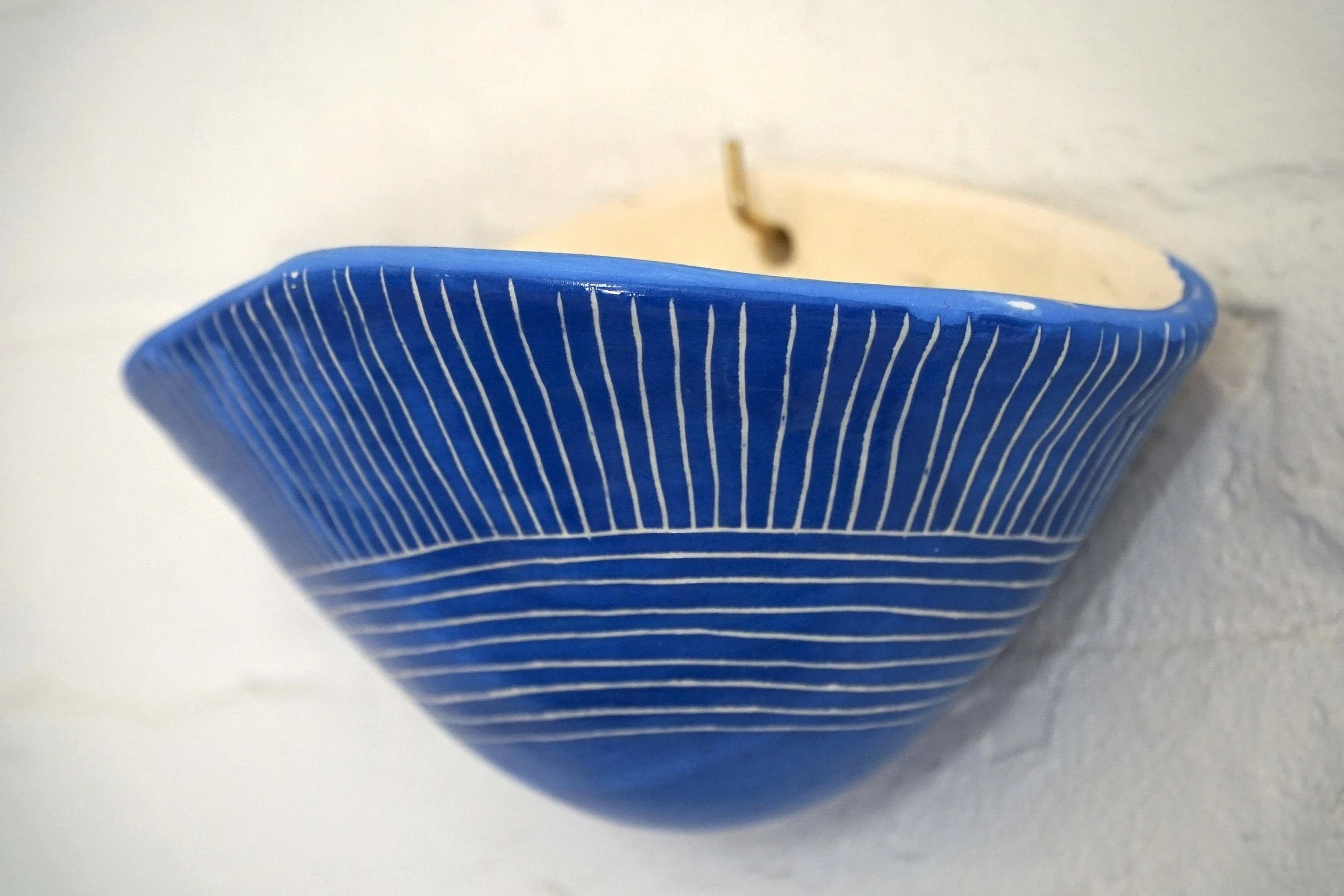 Details: -Handmade ceramic wall pocket planter -Blue & white glazed finish -Carved “Directional Line” sgraffito design -Ready to hang on a sturdy hook or nail -Great for succulents, small houseplants, and indoor plant displays