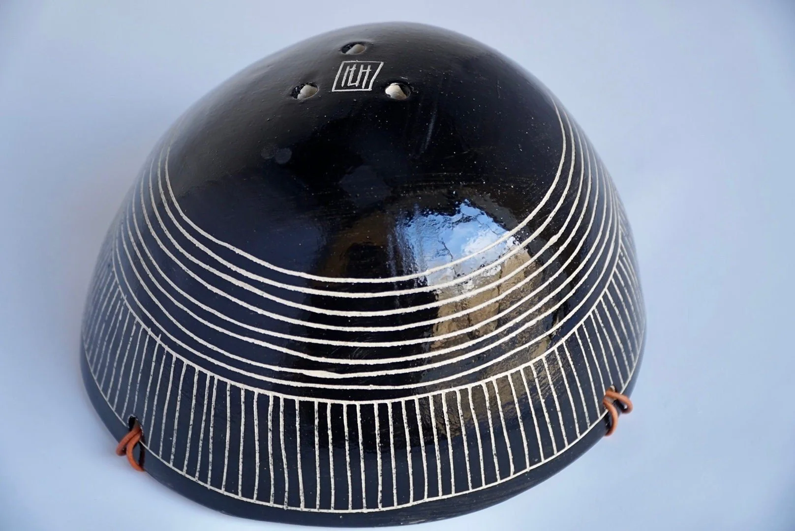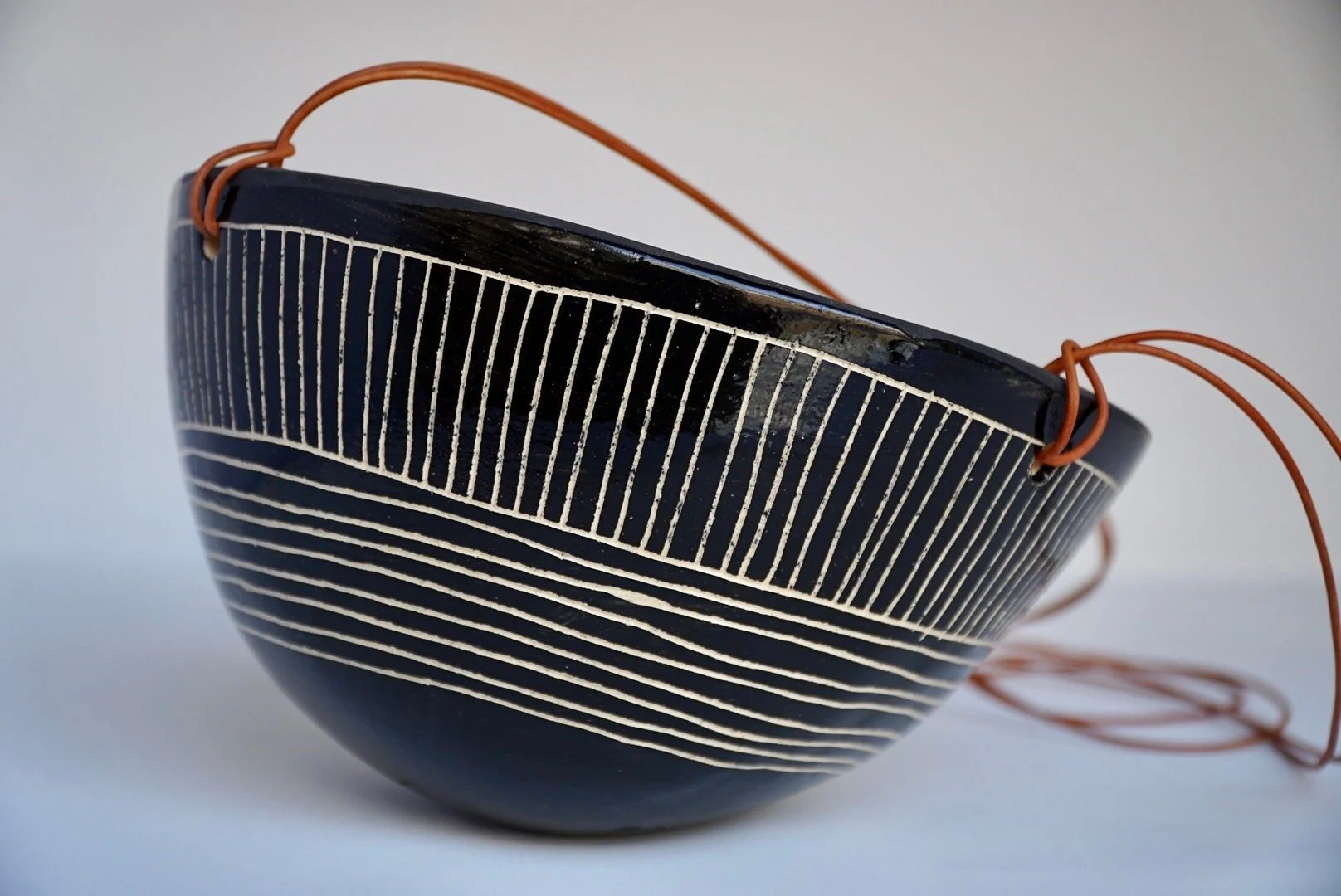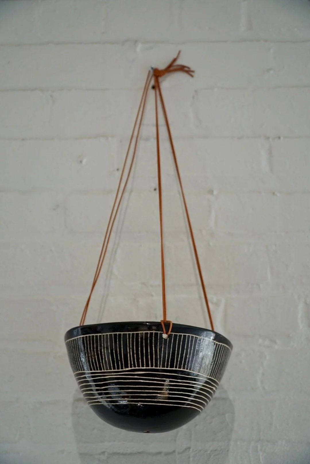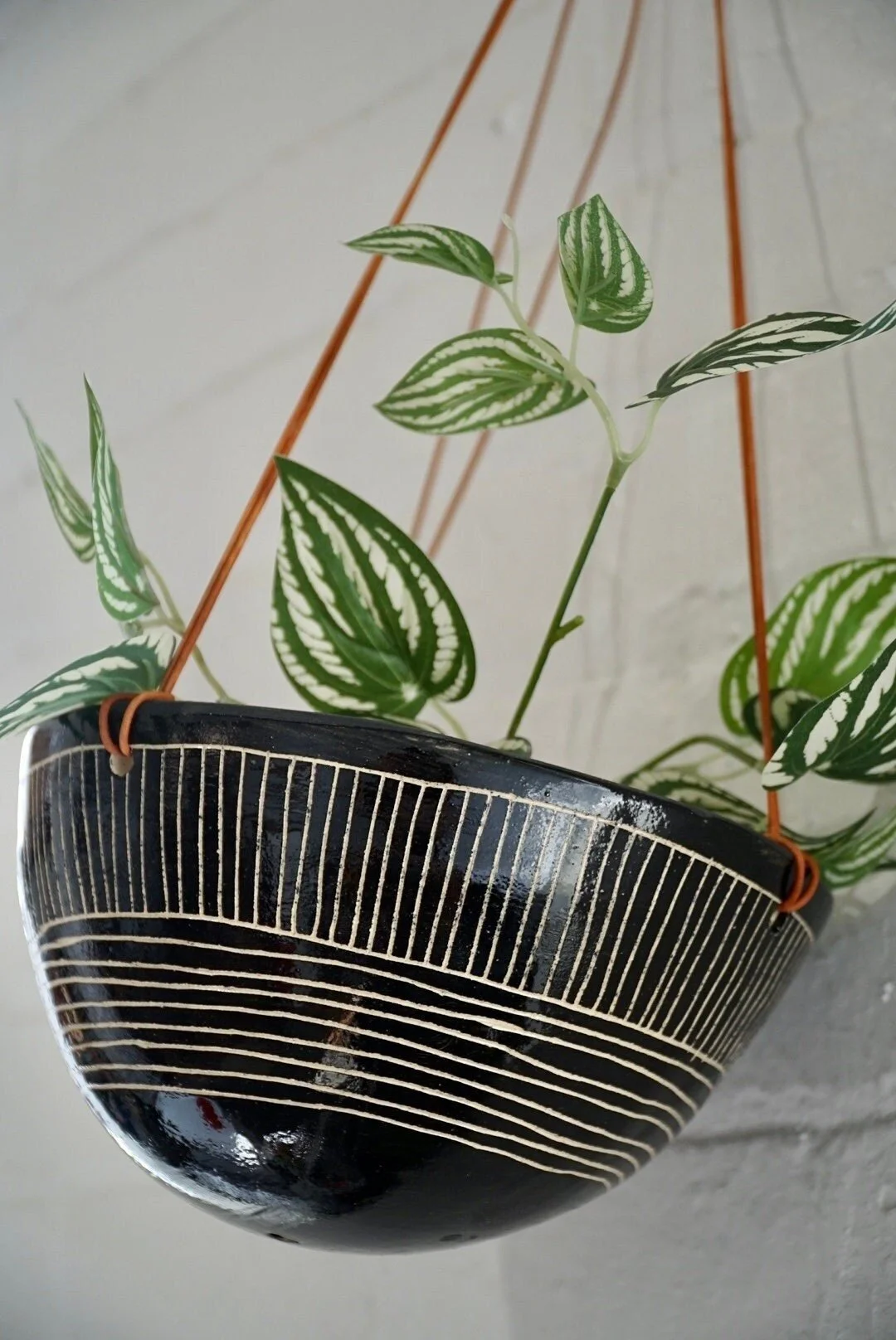 Help your houseplant feel right at home in this one-of-a-kind ceramic hanging planter. Bold patterns of contrasting black and white create a striking backdrop for any plant, turning this functional vessel into a piece of art. Crafted from bright white clay, the surface is finished with a velvety black underglaze and hand-carved with a Directional Line pattern using the sgraffito technique. The planter is glazed inside and out with a clear coat for added durability and easy cleaning.